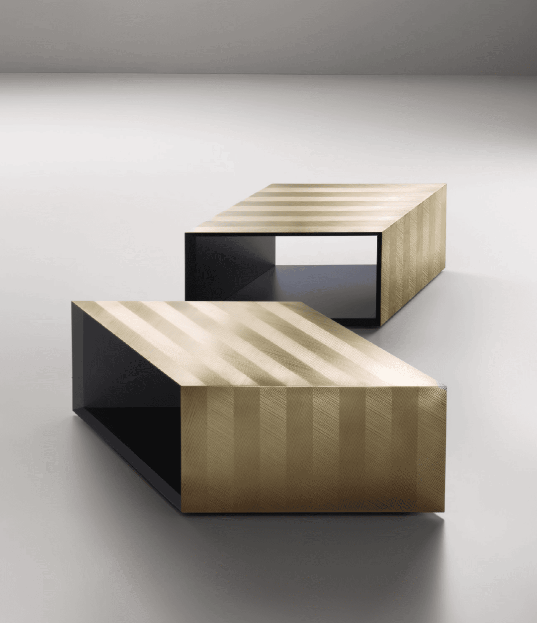 Поверхность столика, выполненная из меди или латуни с использованием фирменной техники DeErosion, украшена диагональным полосатым узором. Этот приём не только подчёркивает геометрическую форму Alpha, но и создаёт яркий графический эффект, который оживает под светом, добавляя глубины и характера. Встроенное пространство для хранения делает столик ещё более практичным, сохраняя при этом его минималистичную элегантность.