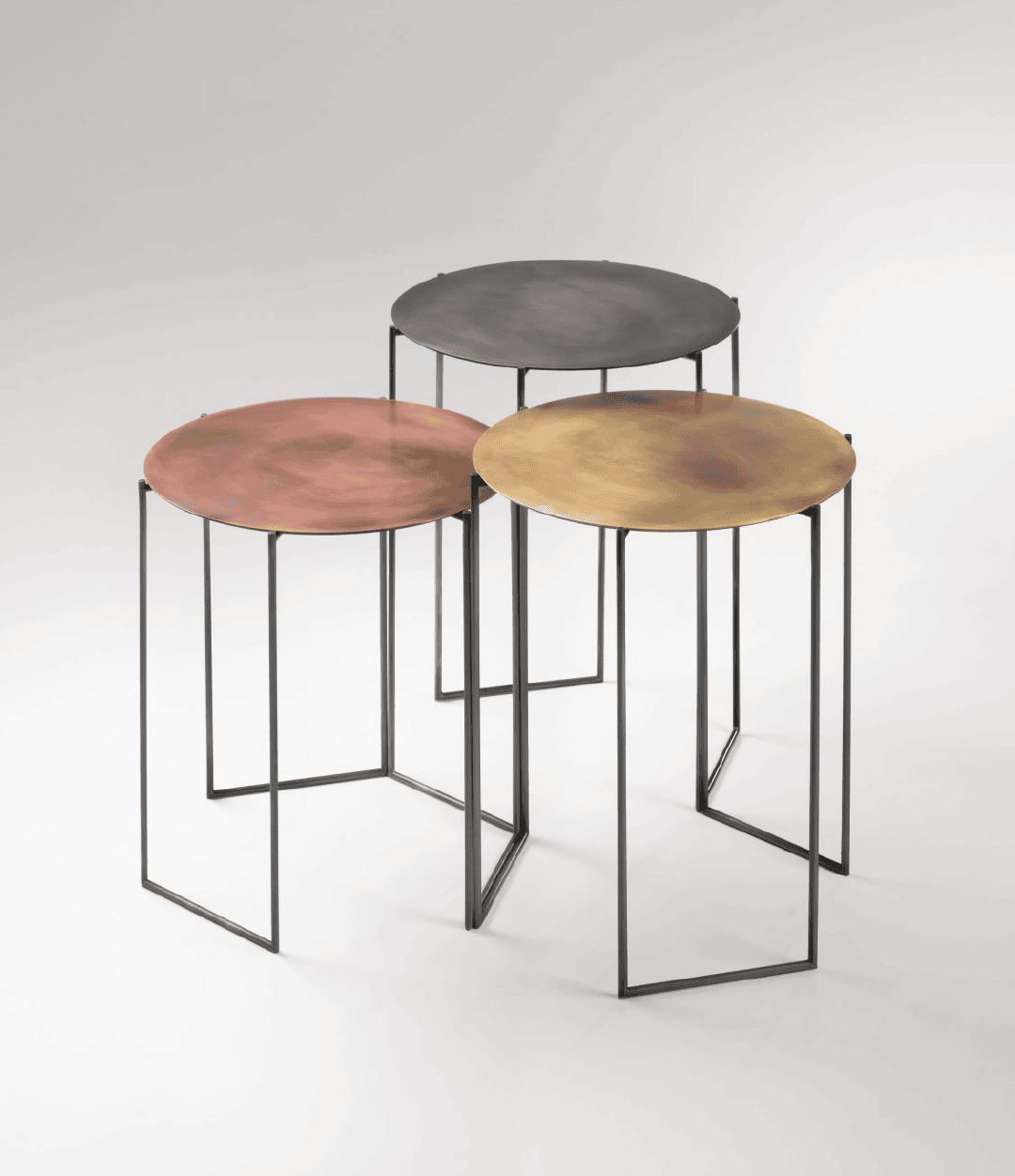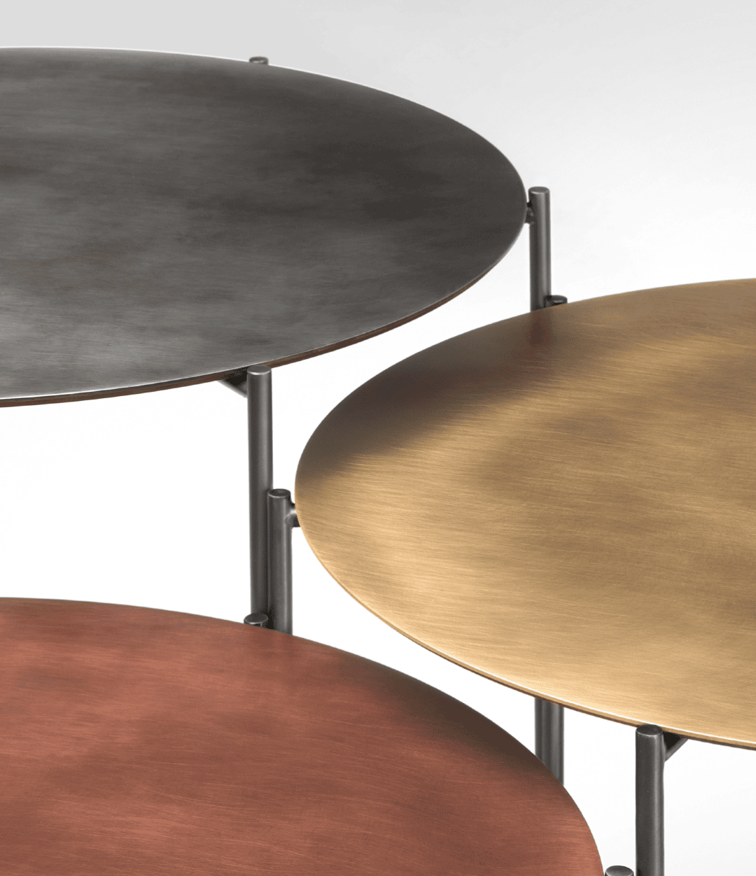 Столовый гарнитур Band — это воплощение современной «микроархитектуры», где основное внимание уделено легкости форм и чистоте линий. Тонкие вытянутые ножки придают конструкции деликатность, а круглые столешницы становятся акцентом благодаря глубокой и благородной игре металлических оттенков. Каждый предмет коллекции изготовлен из нержавеющей стали, латуни и меди, что позволяет в полной мере раскрыть всю палитру уникальных отделок De Castelli.