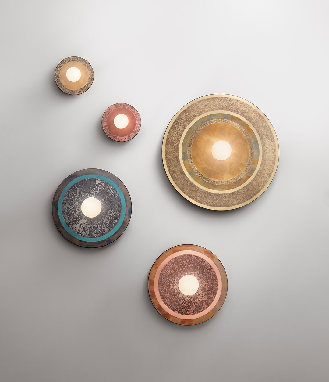 Сталь, латунь и медь чередуются в окисленных и сатинированных отделках, подчёркивая игру форм и превращая тонкий металлический круг, в котором скрыт источник света, в многоцветную мозаику. Центральный матовый стеклянный шар рассеивает мягкий, но при этом точный свет, отражаясь от поверхности металла и раскрывая глубину оттенков и текстур.