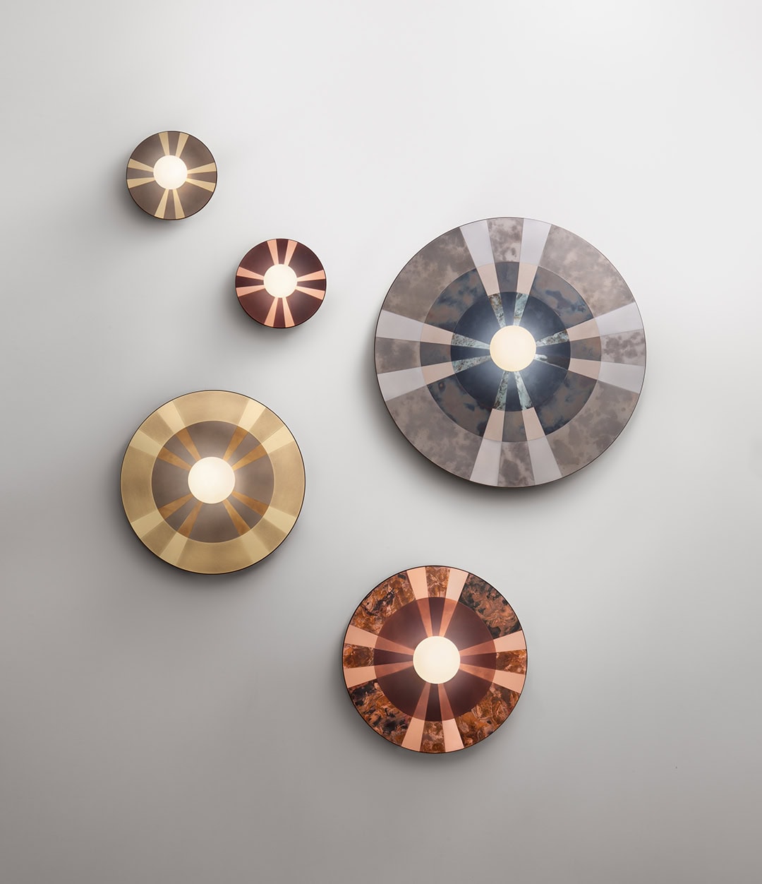 Caleide Èto от De Castelli — это коллекция светильников, в которой гармонично соединяются металл и свет. Каждая лампа формируется из уникальных геометрических композиций, создающих разнообразные визуальные эффекты. Сталь, латунь и медь чередуются в окисленных и сатинированных отделках, а переплетение форм подчеркивает изящную круглую металлическую пластину, в которой размещен источник света, превращая её в полихромный мозаичный «холст».