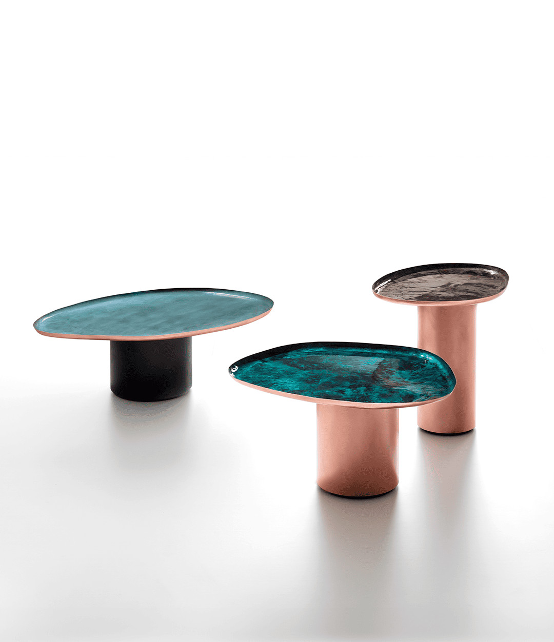 Drops — это коллекция кофейных столиков, вдохновлённая естественными, нерегулярными формами капель воды на поверхности. Мягкие, узнаваемые линии подчёркивают мастерство и ремесленное искусство De Castelli, которое возродило традиционную технику ручного ковки и формовки меди.