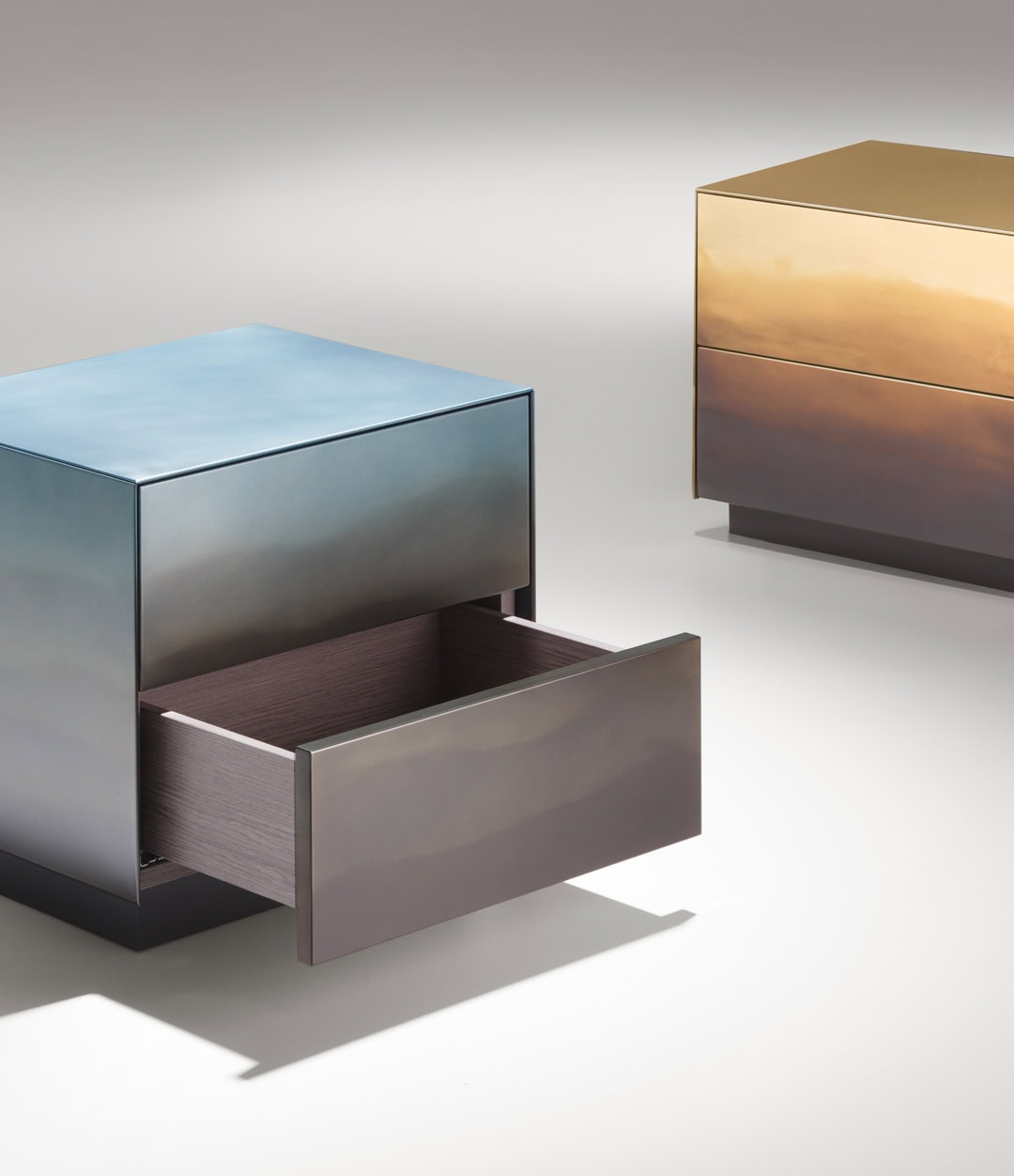 Версия тумбы Marea Bed с двумя выдвижными ящиками превращает обычный элемент спальни в настоящий акцент интерьера. Этот предмет мебели находится на стыке искусства и дизайна: полностью ручная отделка металла придает поверхности тонкую, почти акварельную текстуру.