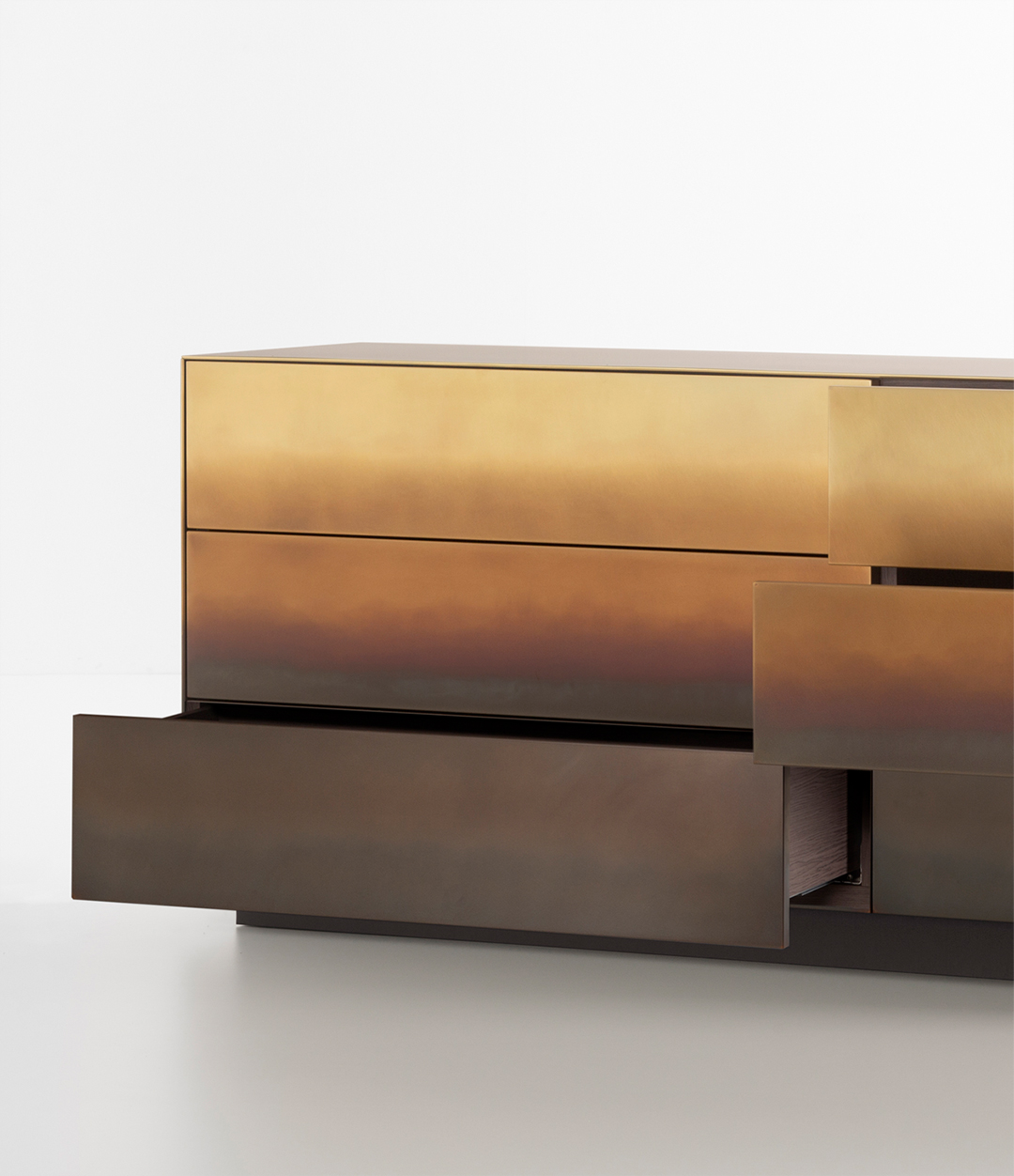 Следы времени накладываются друг на друга, проявляясь в изменчивой текстуре строгих металлических форм. Как прилив (marea) оставляет свои отметины волна за волной, мастер создаёт художественный эффект эрозии воды на материале через многократное окисление. Marea Sideboard доступен и в других отделках De Castelli, позволяя адаптировать его к различным интерьерным концепциям.