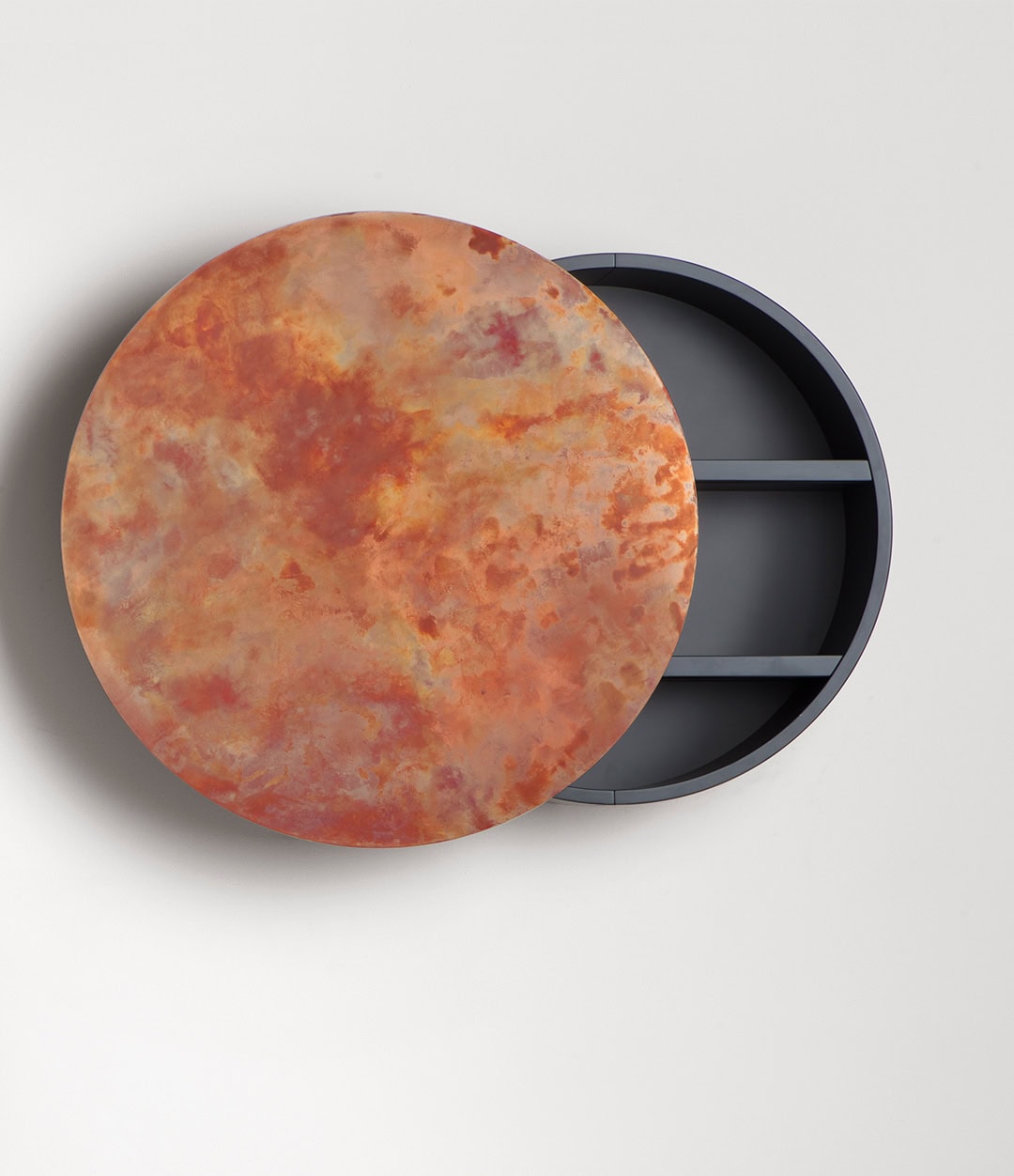 Шкаф открывается с помощью телескопических механизмов, сдвигая дверь вправо или влево, превращаясь в изысканный объект, напоминающий небесное тело в воображаемом затмении. Mida одновременно выступает практичным элементом и декоративным акцентом на стене, словно абстрактная живопись.