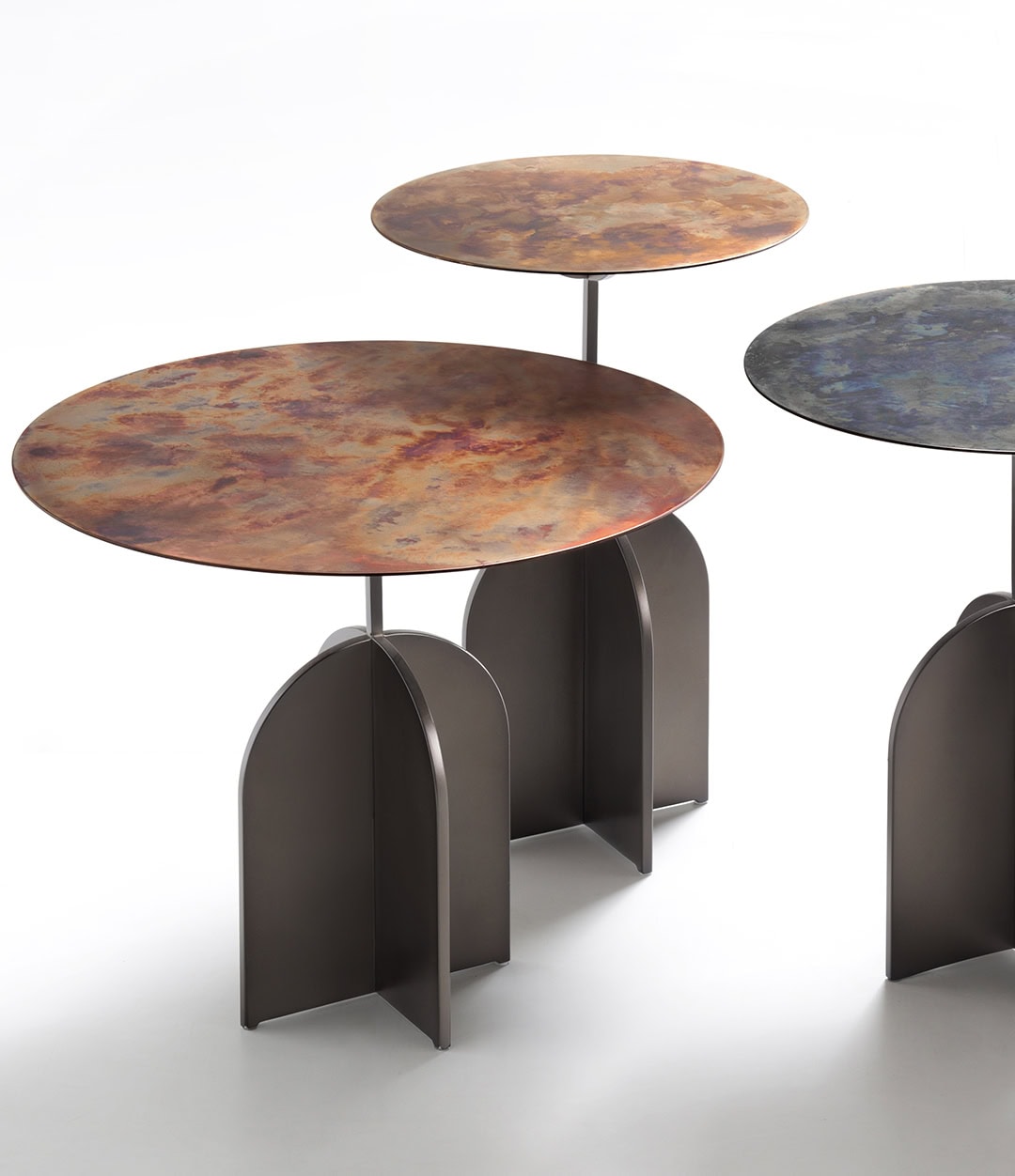 Основание и стебель, выполненные в текстурной отделке DeLabré, подчёркивают глубину и выразительность металла, мастерски обработанного De Castelli. Столешница же сияет благодаря изысканным металлическим отделкам – от нержавеющей стали до латуни или меди, – которые добавляют ей утончённости и индивидуальности. Этот контраст материалов и форм создаёт визуальную динамику, которая притягивает взгляд и наполняет пространство характером.
