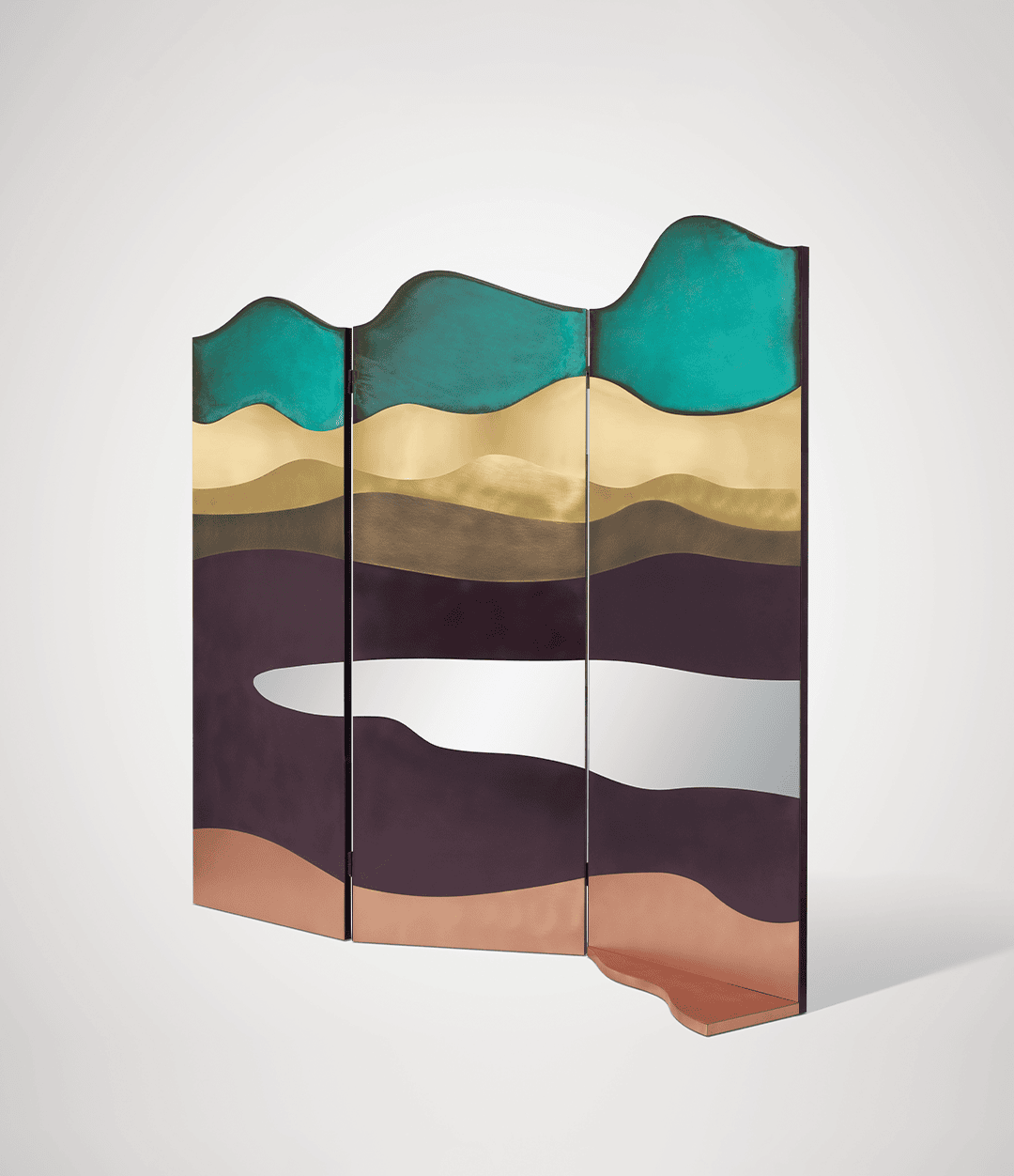 Медные элементы с сатинированной отделкой и латунь DeLabré очерчивают пространство на дальнем плане, а текстурный черный металл контрастирует с воздушной патиною verdigris, формируя воображаемый пейзаж, где сменяются воображаемая природа, ночное небо и силуэты холмов. Painting объединяет художественный подход и мастерство работы с металлом, превращая панно в выразительный объект интерьера.