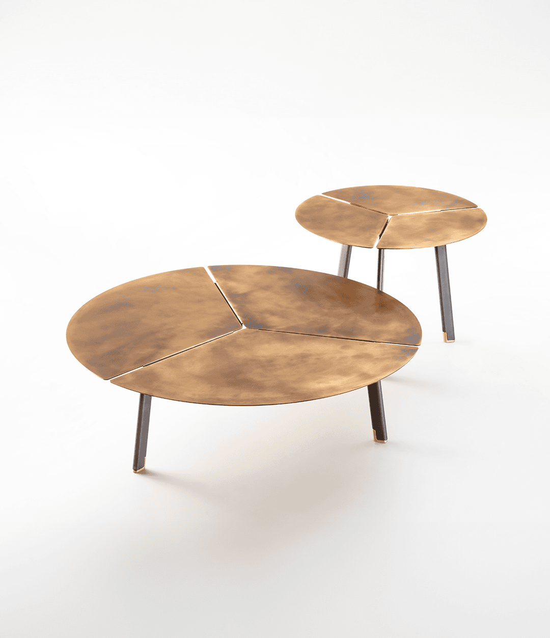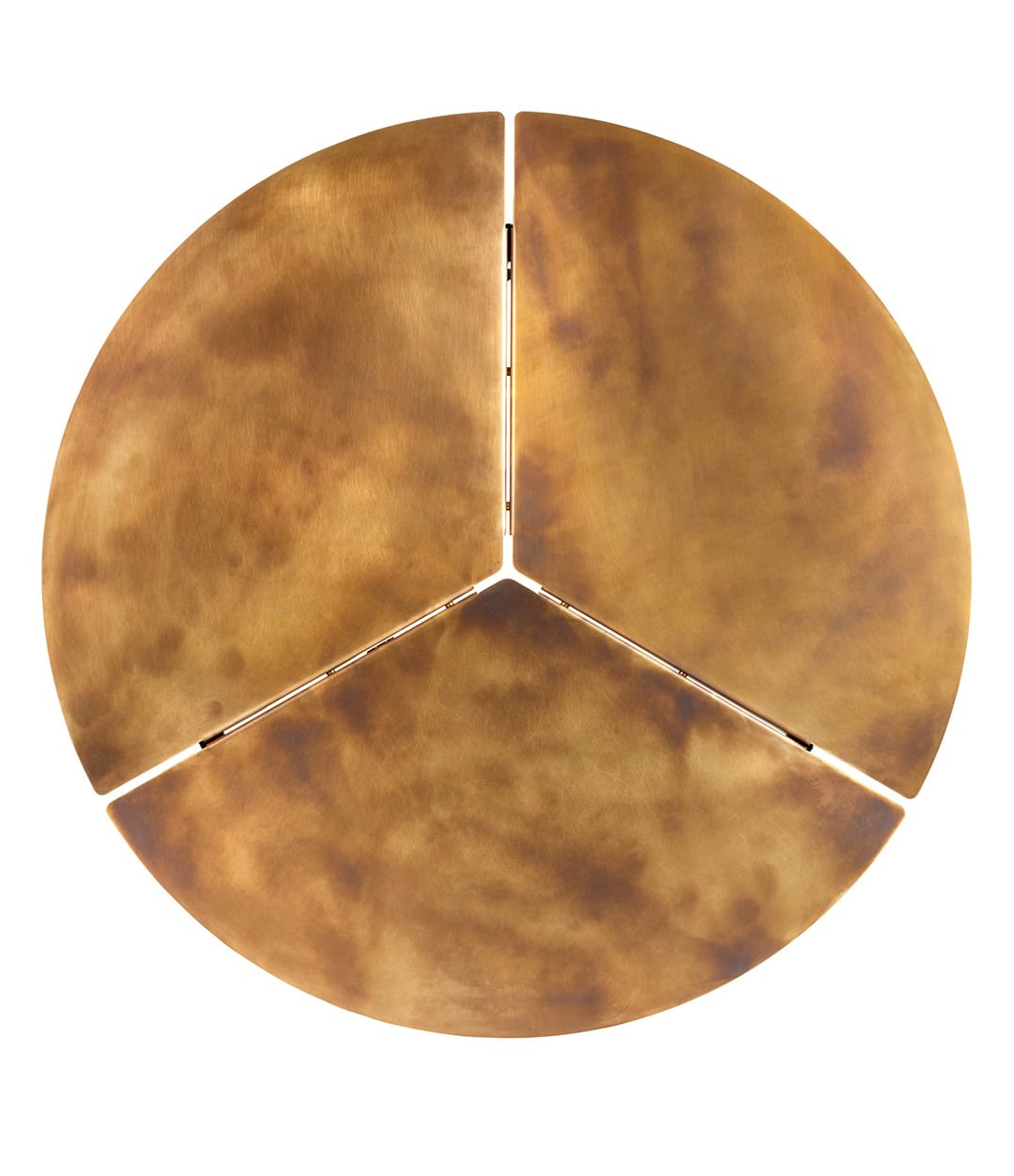 Стол Placas от De Castelli — это утончённое сочетание минимализма и выразительной эстетики, где три клина, словно лепестки, раскрываются, образуя изящную круглую столешницу. Поддерживаемая прочной опорной рамой, эта конструкция подчёркивает геометрическую гармонию и красоту материала, облагороженного фирменной отделкой DeLabré. Уникальная текстура поверхности играет со светом, создавая живые блики и тени, которые делают каждый стол поистине особенным.