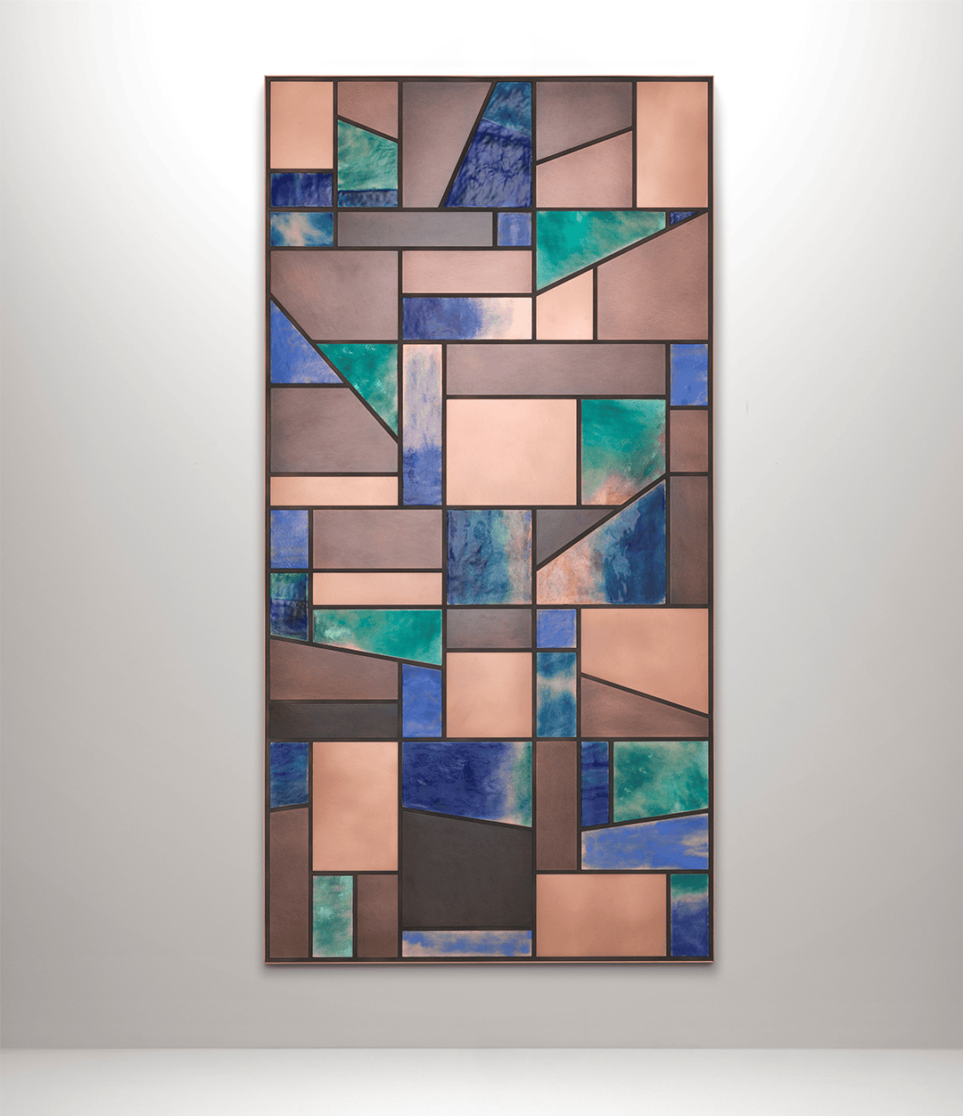 Poyagi от De Castelli — это настенное покрытие из мозаики медных плиток разных форм и размеров с сочетанием окисленных и эмалевых отделок. Рамка выполнена из нержавеющей стали с медным финишем.