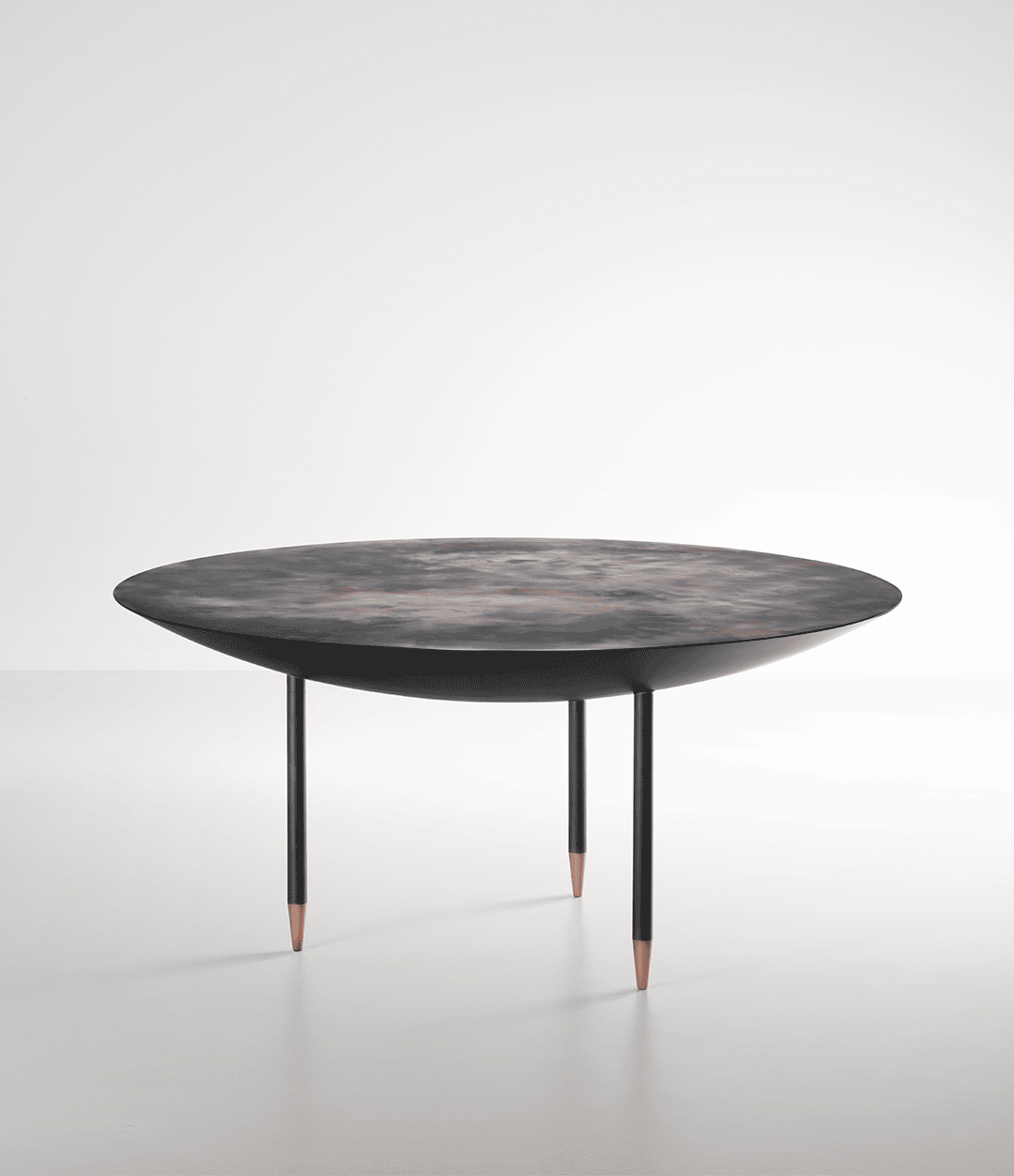Roma от De Castelli интерпретирует форму большого круглого очага, превращая её в символ совместного времяпрепровождения и общения. Столешница и нижний «линзовый» элемент объединяются в единое целое, в которое вставлены три ножки, создавая скульптурный объём.