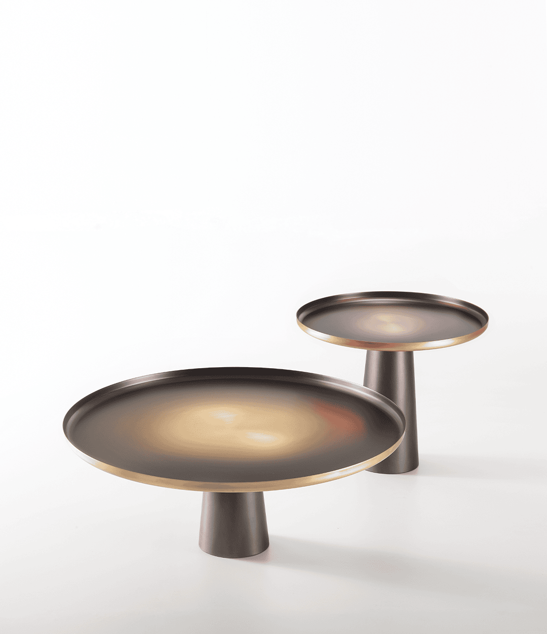 Коллекция приставных столиков Sunrise & Sunset от De Castelli – это поэтическое воплощение природного света, запечатлённое в текстуре и цвете металла. Подобно двум солнцам, эти столики подчёркивают богатство меди и латуни, создавая завораживающий контраст с основанием из железа DeLabré. Столешница, выполненная с использованием ручной отделки, раскрывает чистоту материала: от сияющего центра она плавно переходит к постепенно окисленным тонам, благодаря тщательно контролируемому процессу обработки.