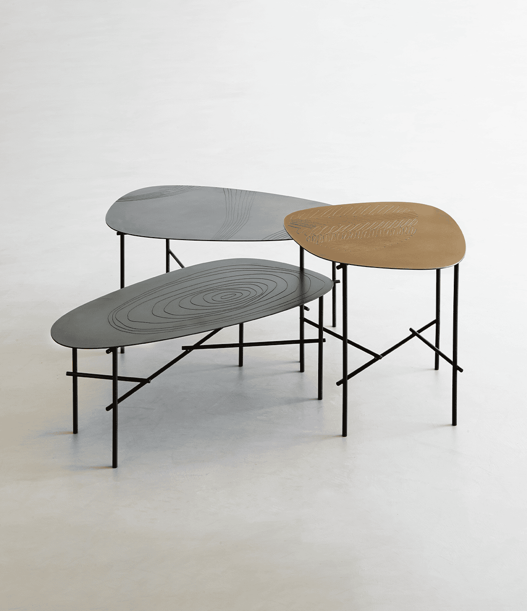 Триптих маленьких столиков Syro от De Castelli – это воплощение органической красоты и утончённого мастерства, вдохновлённое природными формами и движением воды. Тонкая структура из арматурных прутьев поддерживает столешницы из листового металла, на которых выгравированы геометрические узоры, напоминающие примитивные рисунки. Плавные линии, круги, расходящиеся подобно волнам, и текучие формы создают ощущение живой динамики, словно отражение текущей реки или ряби на воде.