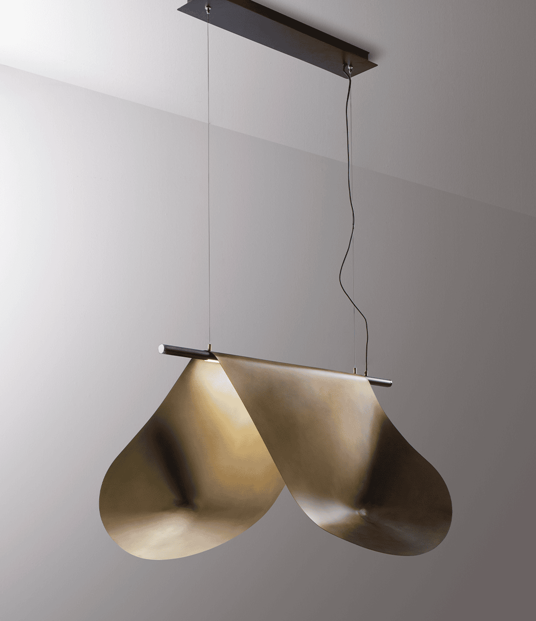 Twist Ceiling от De Castelli — это подвесной светильник, который эффективно освещает пространство, оставаясь при этом элегантным декоративным элементом. Плоская металлическая поверхность превращается в объёмный объект благодаря ручной обработке: сгибание, ковка, формовка и пайка создают светорассеивающие элементы, вдохновленные сложными формами конусов.