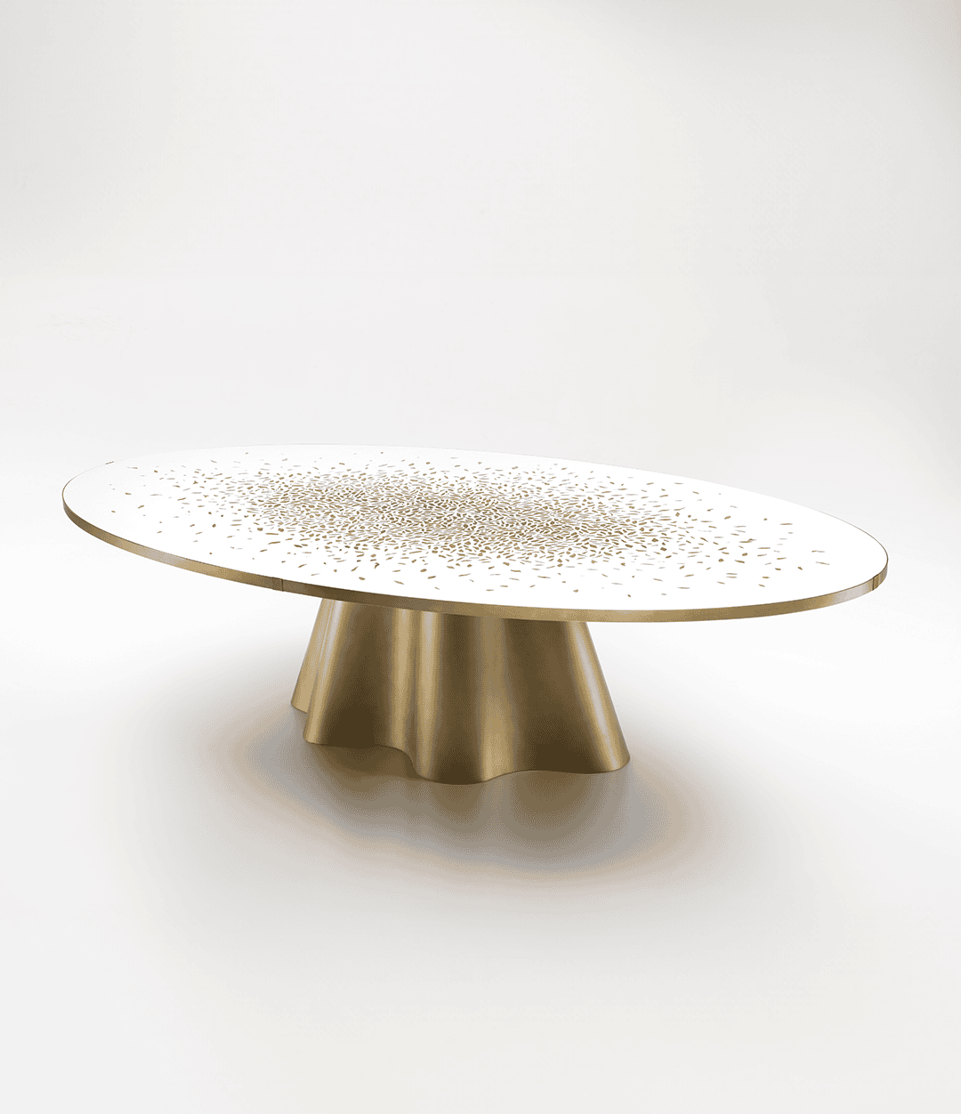 Двумерная латунная столешница контрастирует со скульптурной трёхмерной базой: мягкие, изящные складки чередуются, формируя углубления, которые переходят в сложный конический ствол, одновременно лёгкий и прочный. Vela сочетает мастерство металлообработки и художественное видение, превращая стол в выразительный центр интерьера.