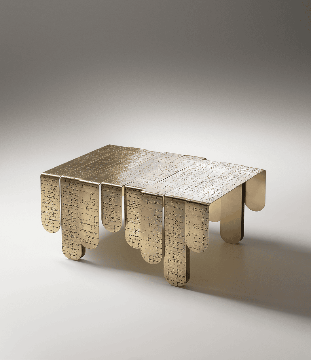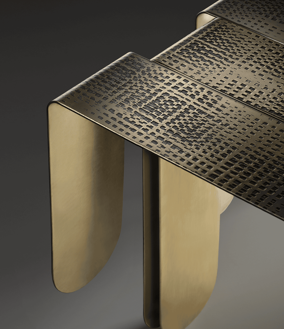 Три листа толстой латуни, закруглённые на концах и различающиеся по длине, сложены и соединены с лёгкой асимметрией, создавая ритмичное движение, напоминающее природные изгибы. Каждая деталь украшена уникальным плетением отпечатков, которые постепенно растворяются в мягко угасающих следах, контрастируя с полированной латунной поверхностью. Эта игра текстур и света придаёт столику живую динамику и подчёркивает его скульптурный характер.