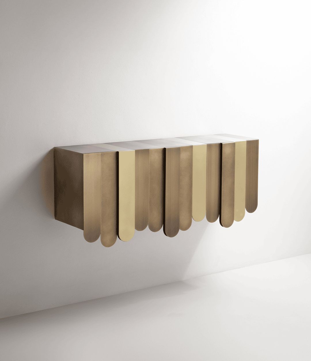 Xilo от De Castelli — это консоль, превращённая в скульптурный объект благодаря чередующимся полосам толстого металлического листа, сложенным сверху и закрывающим фронтальную часть, создавая эффект «водопада». Полосы расположены на слегка выступающих и утопленных плоскостях и отделаны различными металлическими покрытиями De Castelli, подчёркивая текстуру и игру света.